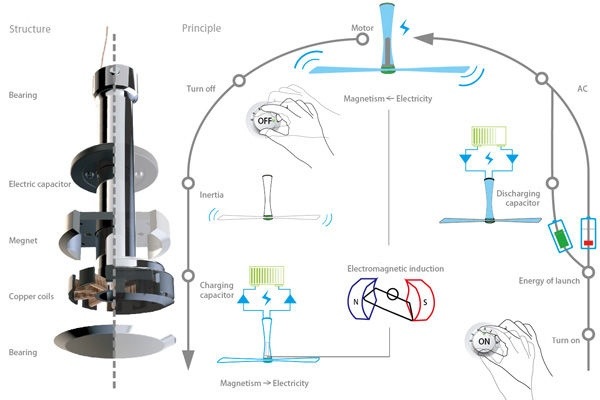 Si ce ventilateur de plafond ressemble à un appareil classique, il peut en réalité conserver son énergie mécanique. Le système utilise l’induction électromagnétique pour couvrir ses besoins énergétiques. Le ventilateur récupère l’énergie cinétique de la palle pour la convertir en électricité.