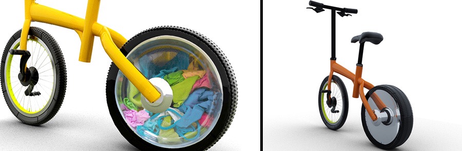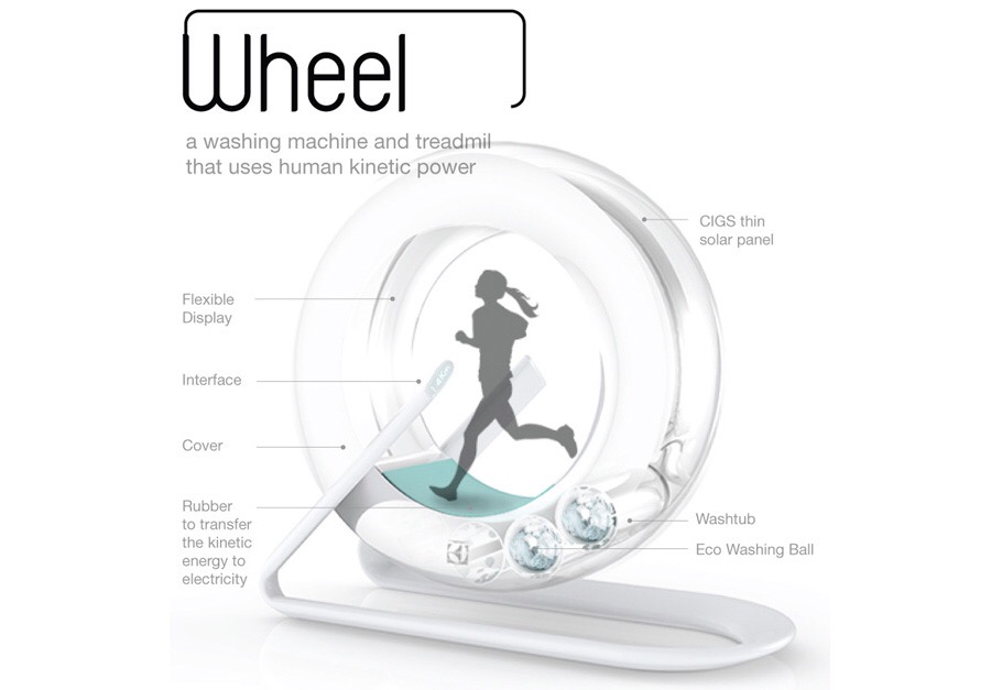 Wheel présenté au concours de design industriel Electrolux Design Lab 2014 est un tapis de course. En courant, l’utilisateur entraîne le tambour contenant le linge et procède ainsi au lavage.