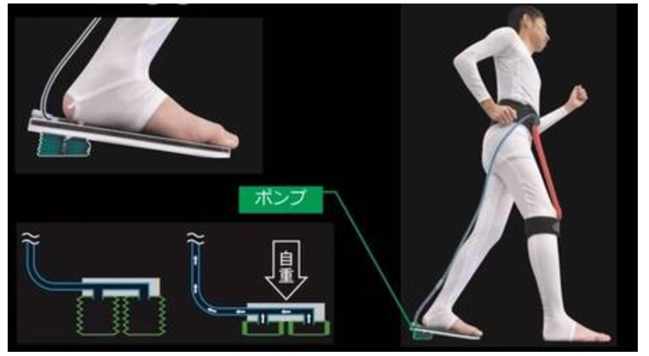 Des chercheurs de l’université d’Hiroshima ont eu une idée toute simple. Une pompe est placée sous le talon pour injecter de l’air sur un gel particulier. Le gel, au contact de l’air, se rétracte, accompagnant le mouvement.
