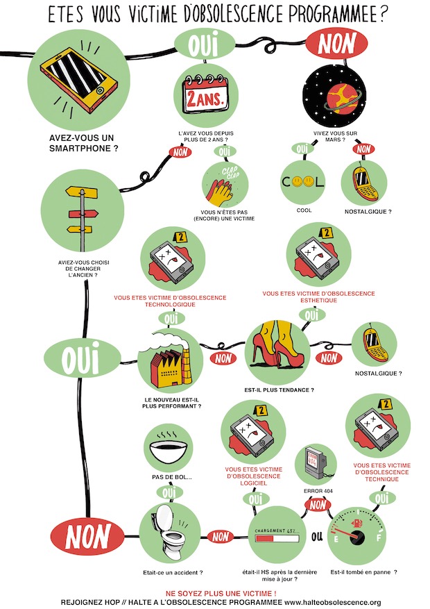 A noter : depuis la loi n° 2015-992 du 17 août 2015, l’obsolescence programmée constitue un délit, défini par l’article L. 441-2 du Code de la consommation comme « le recours à des techniques par lesquelles le responsable de la mise sur le marché d’un produit vise à en réduire délibérément la durée de vie pour en augmenter le taux de remplacement ».